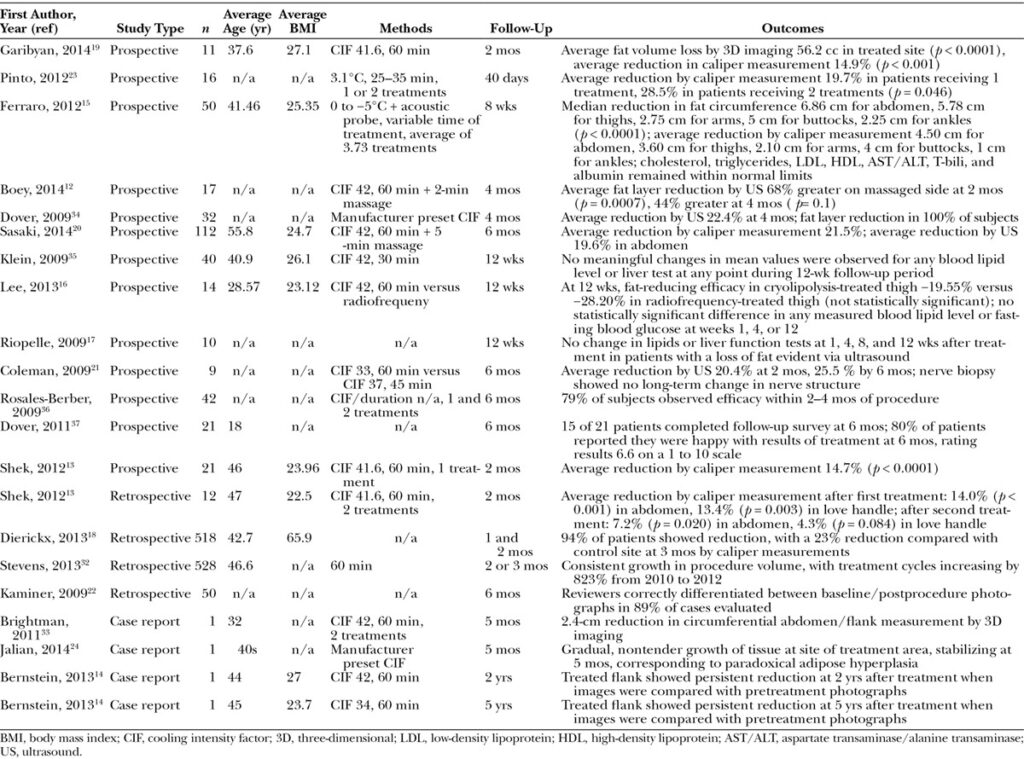To identify clinical studies that assessed outcomes of cryolipolysis, a systematic review of the MEDLINE and Cochrane databases was performed with the search algorithm cryolipolysis OR cool sculpting OR fat freezing OR lipocryolysis.