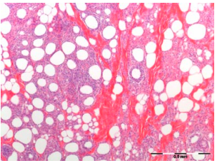 The treatments resulted in a significant reduction in the superficial fat layer without damage to the overlying skin. Smooth inward contour changes, noticeable upon visual examination of the test sites, correlated to decreased thickness of the fat layer as measured by ultrasound 90 days post-treatment. The reduction in the fat layer was 33% as determined from the ultrasound measurements and the pathologic specimens. The reduced fat layer was preceded by an inflammatory response (Fig. 1) triggered by cold-induced apoptosis of adipocytes and subsequent phagocytosis of the lipids. Serum lipids levels remained within the bounds of normal variation throughout the 90-day evaluation period.
