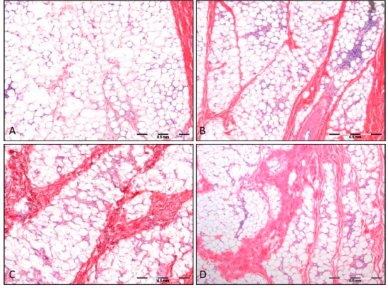 Histologic analysis at various time periods after cold exposure demonstrates that cryolipolysis results in the death of adipocytes that are subsequently engulfed and digested by macrophages [4,5]. Immediately following treatment, there are no discernible changes in the subcutaneous fat; no inflammatory cells are present and the membranes of the cells are intact. Within 3 days of treatment (Fig. 2A), however, there is evidence that an inflammatory process stimulated by adipocyte apoptosis has begun, as reflected by an influx of inflammatory cells. The inflammation appears to peak at approximately 14 days (Fig. 2B) following treatment as the adipocytes are surrounded by histiocytes, neutrophils, lymphocytes, and other mononuclear cells. Between 14 and 30 days (Fig. 2C) after treatment, phagocytosis of lipids is apparent; macrophages and other phagocytes surround, envelope and digest the contents of dead cells as part of the body’s natural injury recovery response to rid the body of unwanted material. The fat cells become smaller and irregularly shaped as they are slowly digested by the macrophages surrounding them. After this period, the inflammatory response appears to subside and the volume of the fat cells is decreased with apparent thickening of the interlobular septae occurring by 60 days (Fig. 2D). The inflammatory process declines further by 90 days after treatment. The area previously containing fat cells is decreased and the septae constitute a majority of the tissue volume.
