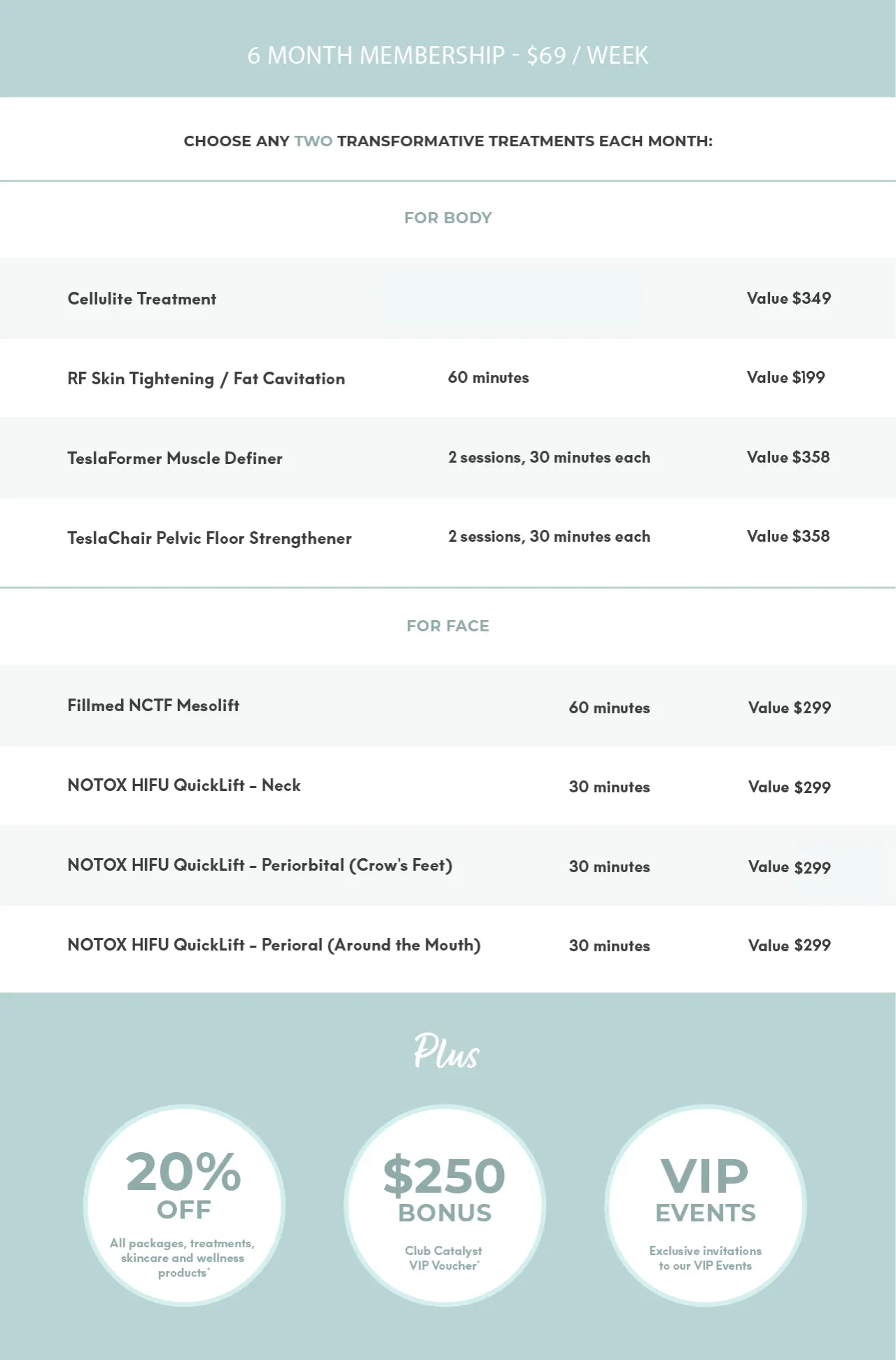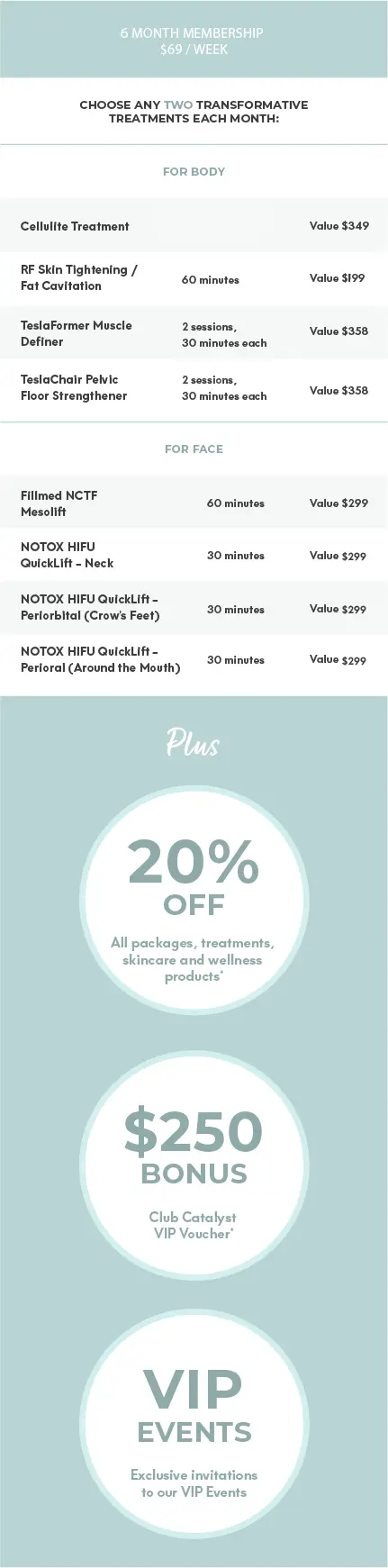 As a member of CLUB CATALYST you can choose ANY TWO treatments per month: