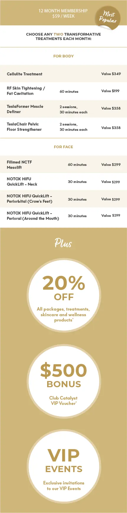 Join the Club today and gain access to the best version of you all year round! Maintain your results with your favourite treatments, or try new ones! Plus receive members-only discounts on treatments and products, a VIP voucher and invites to exclusive events. So what are you waiting for? All these benefits and more are waiting for you at Club Catalyst.